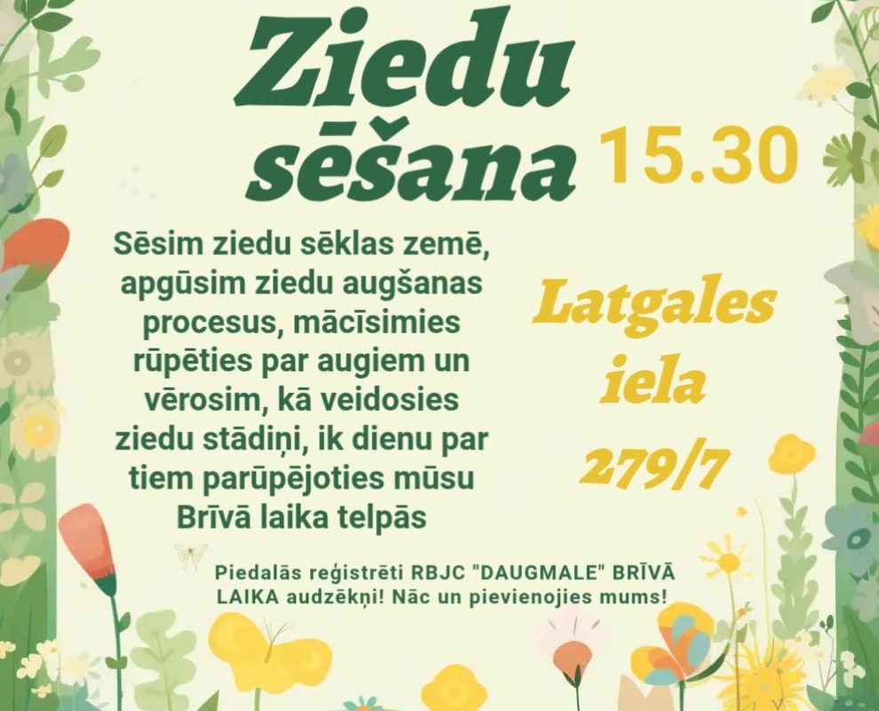 Sveiksim pavasari ar ziedu sēšanu! Vērosim kā no sēkliņas top stādiņš, rūpēsimies par augiem ik dienu Brīvā laika telpās, līdz varēsim tos stādīt mūsu puķu dobē. Nāc un iesēj savu ziedu sēkliņu!